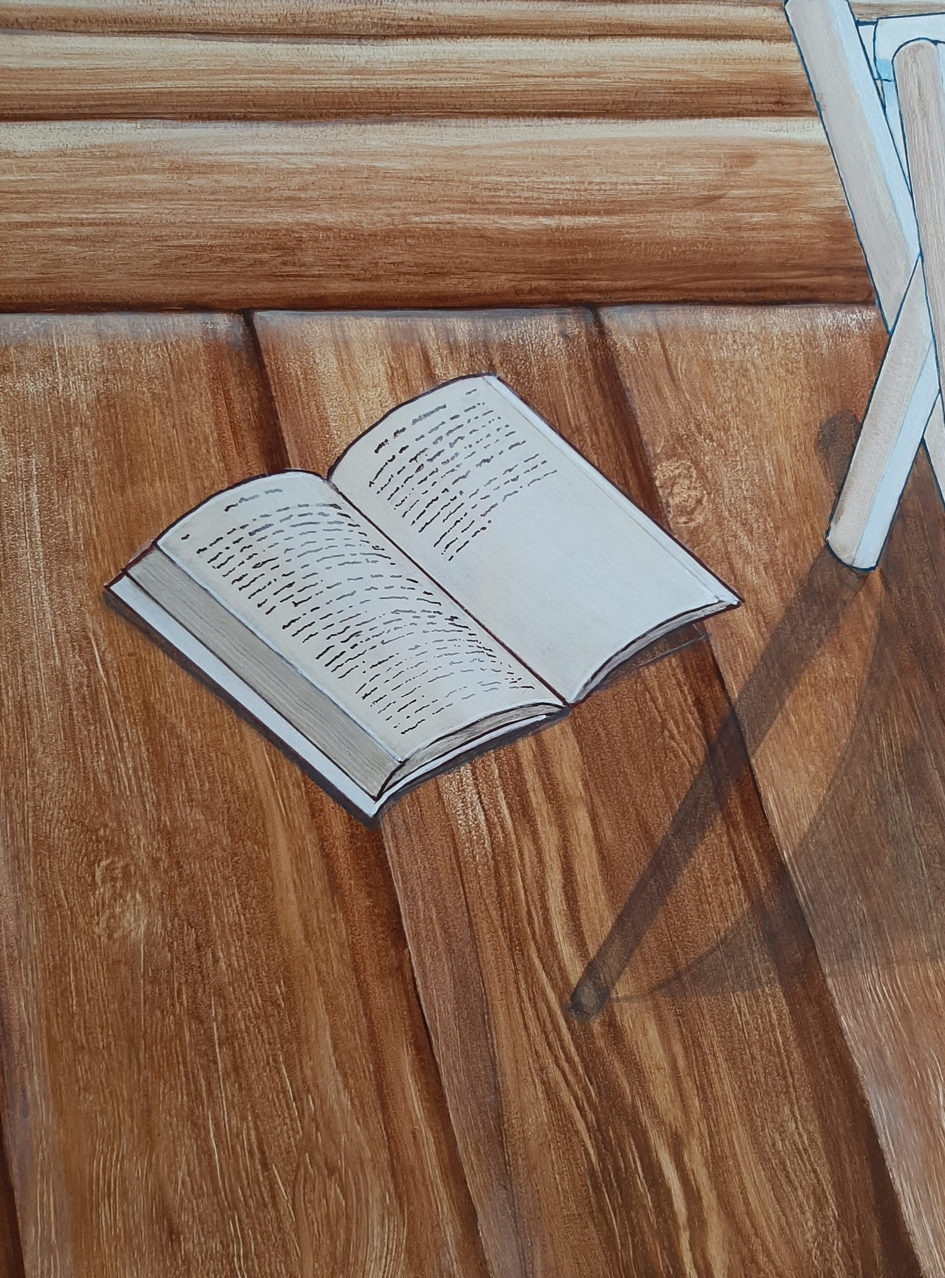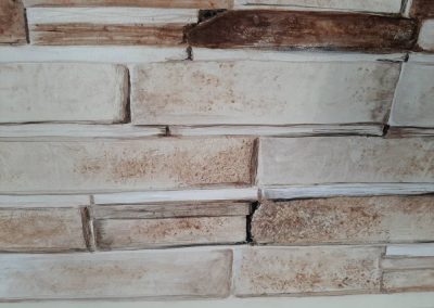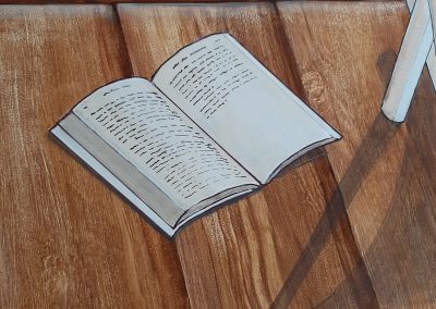 Techniques utilisées : peinture acrylique, trompe-l’œil bois, patines murales, et peinture de maquette.